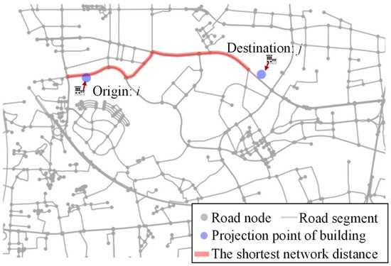 These three travel patterns applied different computation methods for travel time in accessibility measurement. In addition, to get an accurate estimation of travel time, the distance measuring from an origin i to a destination j used the shortest network distance based on the A* algorithm [27], as shown in Figure 3. It should be noted that the shortest network distance for each transport mode was acquired from different road networks. The corresponding data were collected from pedestrian road networks (for walking), public transportation routes (for public transport), and traffic road networks (for private vehicles).