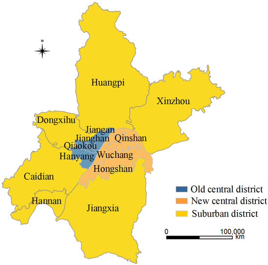 Wuhan is an important city in central China with a multi-center urban spatial structure [17]. In the city of Wuhan, there are 13 districts. Seven of them are located in the central urban region, and the rest are located in suburban area (Figure 4). The central districts in the city of Wuhan were further classified into the new central district (e.g., Wuchang, Qingshan, Hongshan) and the old central district (e.g., Jiangan, Jianghan, Jiangan, Qiaokou) based on the economic development sequence. To verify the proposed method in this study, we selected nine gated communities from three kinds of districts as a case study, including the new central district -- Wuchang, old central district—Jiangan, Hanyang, and newly developed district -- Caidian. The detailed information, including the identification number, total area, and the number of buildings, was listed in Table 2. In this study, the housing price used for the analysis of association with social factors was acquired by manual searches from the real estate websites (e.g., HomeLink Real Estate).