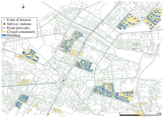 The data used for accessibility measurement include the demographic data, road networks, building information, point of interest (POI) data, and social media data. The demographic data of experimental area were acquired from the GeoQ platform, which provides the latest population data according to the national census data. Road networks, including pedestrian networks and vehicle networks, were downloaded from OpenStreetMap (OSM). These road networks were used to compute the travel time between residential locations and destinations. The information of the point of interest (POI), including the type and location coordinates, was acquired from the Gaode map. The detailed information of communities was extracted from the OSM platform, including the boundary of the community, location, and geometry structure of each building in a community. Beyond that, comments for residents’ living experiences were acquired from the Weibo platform using web crawler technology. Figure 5 shows part of POI locations, road networks, communities and buildings, and public transport stations in the Wuchang district.