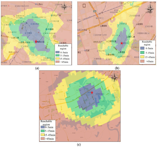 In this study, we applied travel time to estimate residents’ daily traveling costs. As mentioned above, there are three types of travel modes: (1) walking, (2) walking and then taking public transport, and (3) walking and then driving a private car. Among these three patterns, the priority mode is walking. For example, residents need to walk from their home to a transit place (e.g., bus stop, metro station, or parking lot) before they decide to take public transport or drive a private car. The path distance from each building to a transit place determines the duration of walking time. Therefore, the varying locations of buildings in a community are associated with the difference in walking time, thus further affecting the total travel time. To understand the difference in the three trip patterns, we analyzed the reachable area for each pattern by constructing the accessibility equivalent circle. That is, the accessibility threshold for each equivalent circle was computed by setting several thresholds of fixed travel time. In this study, the thresholds of travel time included four levels: 0–5 min, 5–15 min, 15–45 min, and longer than 45 min. Then, we computed the reachable area of each building within the accessibility equivalent circle under different trip patterns. It should be noted that for the last two patterns (e.g., walking and then taking public transport, and walking and then driving a private car), the fixed travel time also included the time that residents walk to the bus station or parking lots from their living building. Figure 6 visualized the reachable area of the third trip pattern in three communities. Here, the buildings in each community were represented as a single point, marked with a red asterisk. As in a normal case, residents spend 0–15 min walking to the nearest transport stations. To overcome the potential issue that the reachable area approaches zero, especially for the second and third trip patterns, we defined the area using 15–45 min traveling time.