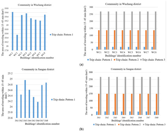 To further analyze the difference of the reachable area by taking different trip patterns, we computed the area of all reachable regions in the districts of Wuchang, Jiangan, and Caidian (Figure 7). Based on the statistics in Figure 7, there is subtle variation in the reachable area by taking Pattern 2 and Pattern 3. Therefore, the location difference of each building in a community slightly affects the reachable area for the last two trip patterns. However, building-level heterogeneity was identified for the reachable area under the first trip pattern. This variation typically existed during short-distance travel, between residential buildings and public transport stations. For example, the maximum difference of the reachable area under the first trip pattern for each building in the Caidian district was approximately 1 km2. This distance difference may not affect the traveling experience for a long distance trip under the other two trip patterns: Pattern 2 and Pattern 3. But it has a significant impact on walking activities. Therefore, we focused on analyzing the sensitivity of the proposed method for accessibility measurement at the building level under the first trip pattern (i.e., walking from the building to the destination).