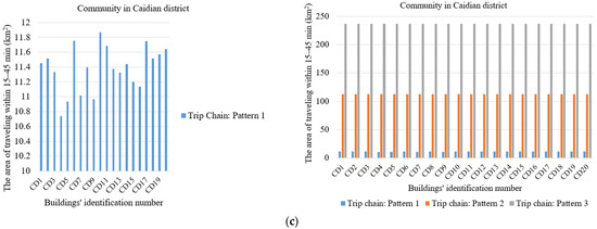 Statistics of the reachable area by taking different patterns of trip pattern, (a) community in Wuchang district; (b) community in Jiangan district; (c) community in Caidian district.