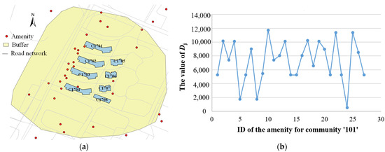 In terms of the travel time cost analysis, a building’s location in a community has a major impact on residents’ walking activity time. The walking time cost may further influence the travel time by taking public transportation or private car. But this effect will decrease with travel distance increases. In this study, to explore the sensitivity of the proposed method for accessibility measurement at the building level, we computed the accessibility of all experimental communities within the walking distance. Based on the existing research, the scope for most residents’ walking activity should be within 1 km [31]. So, the buffer radius r was set to 1 km and constructed based on the boundary of communities. For a community, buildings were considered as origins while amenities in the buffer were accounted as destinations. Taking community ‘101’ in Wuchang district as a case (Figure 8), the value of Nd, NT, tpd, Np, ngood, and Nsign for each building in community ‘101’ is about 27, 355, 4, 10, 15, and 23. Since the area and floors quantity of each building in community ‘101’ are different, the value of Oi of each building i is different. Here, the number of residents for C1701, C1702, C1703, C1704, C1705, and C1706 is about 848. The buildings C1707 and C1708 have about 420 residents. Figure 8a shows that amenities in the buffer are considered as the destinations. Figure 8b shows the population capacity of surrounding amenities which was acquired based on the demographic data. The accessibility of these buildings in Figure 8a was further computed based on the results of the travel time.
