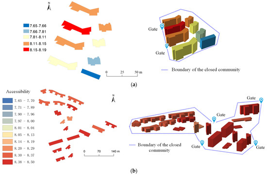Figure 9 shows the results of accessibility measurement for a part of communities in the experimental districts within the walking distance. The left panel of Figure 9 shows the accessibility of each building, and the right panel is the 3D visualization of accessibility with information of the boundary and gate of the community.