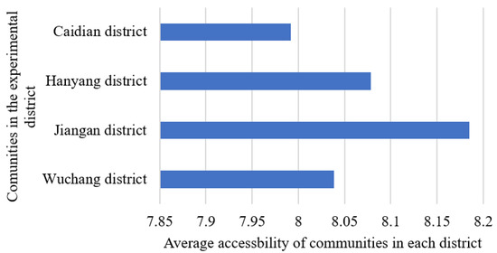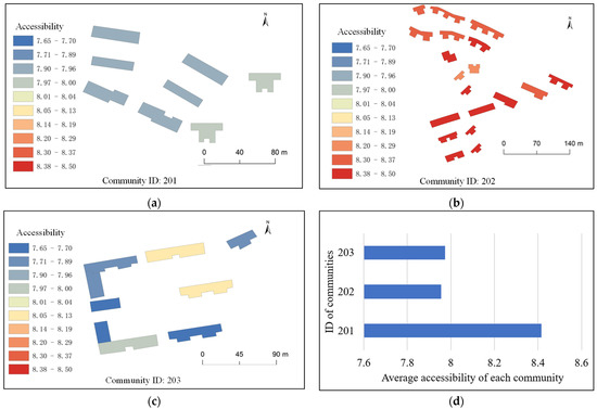 Difference of average accessibility of communities in Jiangan district; (a) accessibility of buildings in community ‘201’; (b) accessibility of buildings in community ‘202’; (c) accessibility of buildings in community ‘203’; (d) average value of accessibility of each community.