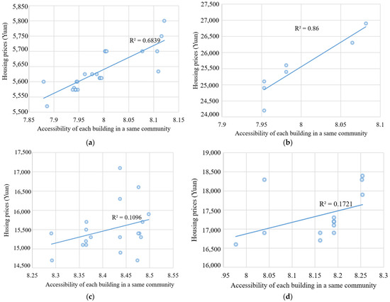 The correlation between accessibility and housing price of buildings in the experimental area; (a,b) respectively show communities in area with lower overall accessibility; (c,d) respectively indicate communities in area with higher overall accessibility.