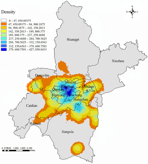 Exploring social equity based on the analysis of housing prices and accessibility is another research topic. For such cases, accessibility of communities has been incorporated in the model, and the computation process is straightforward. For instance, Chin and Foong [14] used a hedonic housing price model to explore the relationship between accessibility and housing values in Singapore. They used the number of employments and the number of prestigious primary and secondary schools in a zone as the accessibility of housing estate. Li et al. [16] investigated the accessibility to key amenities and its impact on housing values in Salt Lake County. In their article, the accessibility of communities was measured based on the percentage of regional employments within 10 min drive and the number of light-rail stations and bus stations within 0.5 miles. In addition, they further discussed the degree to which the real estate market is associated with structural attributes, accessibility, public, and private services in Shanghai [17]. The accessibility of communities in this article was calculated using the number of metro stations and bus stops within 0.5 miles and the number of sharing bikes within 300 m [17]. Although these studies have explored community or housing estate accessibility from the aspects of housing prices, transportation, and amenity distribution, some additional questions remain to be addressed [8]. First, accessibility was computed using fixed distance or time cost, without accounting for the dynamics of an individual’s daily life. In metropolitan areas, with a large population and complex road networks, residents have various travel patterns. Therefore, it is important to set multiple travel times and distances in the model. Secondly, most research on community accessibility was conducted at a district scale but rarely discussed at a microscopic scale, such as community or single-building scale. As a result, the difference in resource using among residential buildings cannot be captured. With the growing trend of smart urban planning, understanding the heterogeneity of resource allocation at microscopic scale has become crucial for policymakers.