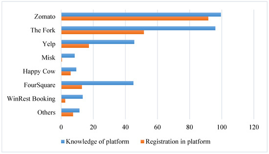 The group of respondents who were not responsible for registering their establishment on TripAdvisor (38.7% of the total) are registered in fewer digital platforms (Figure 6). Those that are registered in digital platforms have chosen the most popular ones: 54.4% are registered in Zomato, 24.2% are in The Fork and 8.7% have registered in other platforms. It is noteworthy that there are no registrations made on platforms such as Yelp, Misk or FourSquare. However, it is important to mention that even though they are registered on fewer platforms, 98% of this group of entrepreneurs mention that they know Zomato, 81.9% know The Fork, 42.3% know Yelp and 30.9% know FourSquare (Figure 6). This discrepancy between knowledge and registration in platforms indicates that lack of knowledge is not the main explanation for their low engagement with the platform economy. Other reasons should be taken into account when questioning the non-presence of these entrepreneurs on certain digital platforms, such as the lack of training in the use of platforms, the spatial, social and economic context, or views against the model that digital platforms promote.