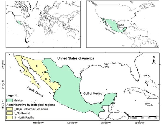 The study region was constituted by three HARs located in Northwestern Mexico: North Pacific, Baja California Peninsula, and Northwest, located between the geographical coordinates 32°39′ and 21°22′ North latitude and 118°52′ and 103°20′ West longitude (Figure 1).