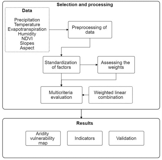 Data preparation was the first fundamental step in our aridity vulnerability analysis. Our methodology was based on GIS analysis and applied EMC techniques. The selection of variables was based on an exhaustive literature review [,,,,,,] of studies on aridity, drought, and desertification (Table 2). The year 2019 was selected as the evaluation period because of the fact that, at the time of this study, it was the most current year with available data.