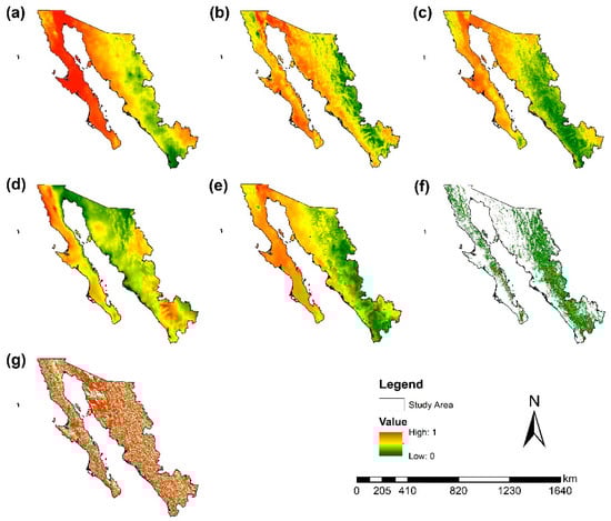 Factors obtained as a result of standardization. Legend: (a) precipitation, (b) temperature, (c) NDVI, (d) evapotranspiration, (e) humidity, (f) slopes, and (g) aspect.