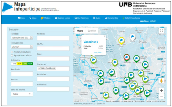 The Mapa Infoparticipa (www.mapainfoparticipa.com, accessed on 1 July 2021)) is an interactive platform for political intervention. The research group publishes on this map the results of an academic investigation that uses a methodology described as a civic audit of the transparency of the websites of local public administrations and other public and private entities. Publication is open and free of charge so that citizens can monitor and evaluate the transparency of these entities, as well as promote improvements in institutional and organizational communication practices.
