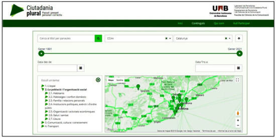 Secondly, we developed the Mapa Infoparticipa (Infoparticipa Map) [11] and the Ciutadania Plural (Plural Citizenship) [12] web platforms. The main tool of the former is a map that represents the results of the evaluation of the transparency of public administrations and other private organizations. It is an instrument conceptualized for political intervention and promoting citizen participation in the monitoring and control of the activity of the governments of public administrations. The latter is a platform that was developed for the construction of knowledge regarding the past and present from a decentralized, networked, collaborative paradigm, relating the local with the global and the personal with the collective. This involved relating three coordinates: space, for which an interactive map is used; time, which is determined by a timeline; and theme, for which an appropriate theming is presented for the proposed purposes.