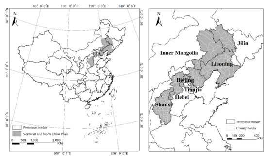 The study area is Northeast and North China Plain (Figure 1), a major maize producing area in China, which includes most of Liaoning Province, the west of Jilin, the east of Inner Mongolia, and the North of Hebei, Beijing, Tianjin and Shanxi. This area has a cold temperate semi-humid climate, with an annual active accumulated temperature of 2000–3600 °C, and an annual precipitation of 400–800 mm from west to east. This region is an important commodity grain base in China due to the superior terrain, soil, climate, and other natural conditions and high degree of mechanization implementation [19].
