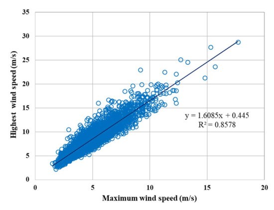 There are three indexes related to wind speed in the daily dataset of meteorological stations: the mean wind speed, maximum wind speed, and highest wind speed. According to the surface meteorological observation norms, the maximum wind speed refers to the maximum average wind speed within 10 min in a day, and the highest wind speed within 3 s, both of which can represent the extreme wind speed in a day. According to the statistics of the data from 1986 to 2015, we found that the observation records of the highest wind speed before 2005 were missing. Considering that there is a significant correlation between the maximum wind speed and highest wind speed [38] from 2005–2015 in Northeast and North China Plain (Figure 2), we selected the maximum wind speed to describe the daily extreme wind speed.
