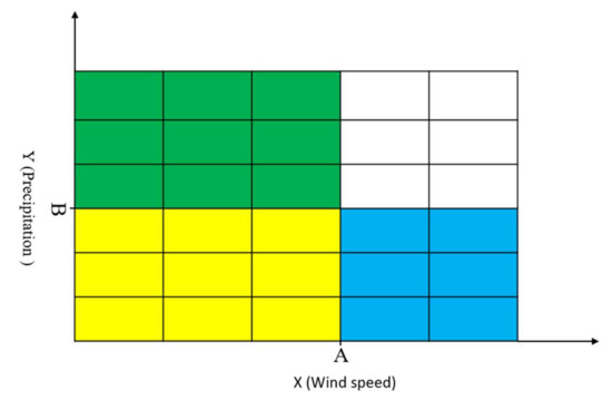 The map of joint probability distribution is three-dimensional; therefore, the joint probability distribution map of variables X (wind speed) and Y (precipitation) was projected onto the plane to get Figure 3. The green area is the probability that the wind speed X is less than value A, and the blue area is that the precipitation Y is less than value B. The yellow area is generated by the superposition of the blue and green areas, as well as the probability in the white area is the information we want to obtain. Therefore, the probability that the wind speed X exceeds A, and the precipitation Y exceeds B can be expressed as: