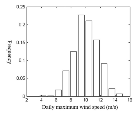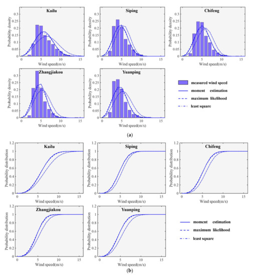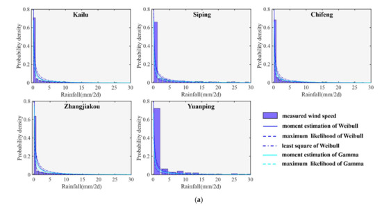 There have been a large number of studies on the distribution of daily maximum wind speed and precipitation, which can basically determine the distribution types that they obey. Daily maximum wind speed follows a Weibull distribution [43,53], and precipitation follows Gamma or Weibull distribution [54,55]. Therefore, as described in Section 2.3, we used moment estimation, maximum likelihood, and the least squares method to determine their probability density and probability distribution function in Matlab (Matlab R2016a).