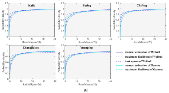 According to the probability density and probability distribution diagram of precipitation for two consecutive days (Figure 5), it can be seen that, in most cases, the precipitation of meteorological stations is relatively small, and probability density presents an “L” distribution. The probability distribution curves obtained by Weibull based on different parameter estimation methods have great differences, while the differences based on Gamma fitting are small.