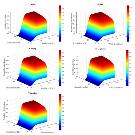 In conclusion, when there is a positive correlation between the daily maximum wind speed and precipitation at meteorological stations, the Gumbel copula function has the best performance. When there is a negative correlation, the Frank copula function would be the best choice. Figure 6 shows the joint probability distribution of wind and rainfall at each meteorological station. Taking Kailu and Siping stations for example, the joint probability distribution of the latter is flatter, indicating that the probability of extreme wind and rainfall events at this site is lower.