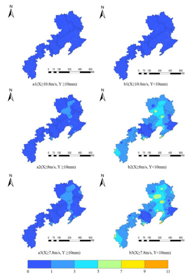 Spatial distribution of the maize root and stalk lodging level. Levels 0 to 11 are lodging occurrence times in the sensitive growth stage, while the lodging degree is partial and above, “a” series represent the distribution of maize root lodging, “b” series represent the distribution of maize stalk lodging, and X and Y, respectively, represent the maximum daily wind speed and precipitation.