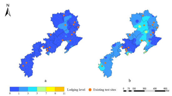 Lodging risk level for existing test sites. Levels 0 to 11 are lodging occurrence times in sensitive growth stage while lodging degree is partial and above, (a,b) represent the level of root and stalk lodging risk, respectively.