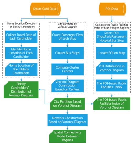 Figure 1 shows the analytics framework of the spatial distribution patterns of the elderly cardholders. Two data sources are mainly used in the data-driven methods: (a) smart card data, and (b) POI data. Three methods are proposed, which are home location identification of the elderly cardholders, city partition by a Voronoi diagram and the mobility model of the elderly cardholders. Two problems are solved using the above methods. First, the home location distribution of the elderly cardholders is represented by a Voronoi diagram. More detailed information of the spatial distribution pattern can be visualized. Second, elderly mobility in a city is modeled in terms of POI data. The model can measure the elderly mobility between regions.
