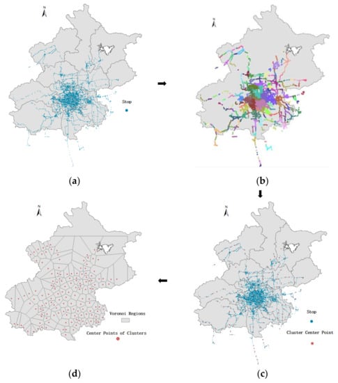 Process of the clustering method to construct Voronoi diagram (a) shows the bus stops’ distribution of Beijing, (b) shows the cluster results of bus stops, (c) shows the center points of each cluster by red points, (d) shows the Voronoi diagrams that are constructed by using the center points of clusters as the seed points.