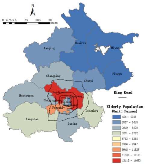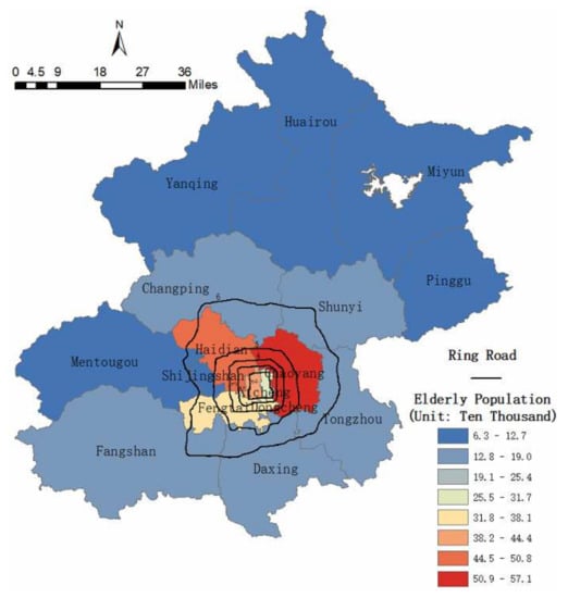 Beijing is the capital of China, which is located in the north of the country and covers a land area of 16,410.54 km2. With rapid economic growth, urbanization development and increased resident population, Beijing has become one of the most densely populated cities on the planet. By the end of 2017, the registered resident population of Beijing reached 13.59 million [8]. At the same time, the increasing elderly population caused a considerable problem for making suitable urban planning policies for city development. According to statistics data, the resident population of the elderly, aged 60 and above, was 3.33 million, which accounted for 24.5% of the total population.