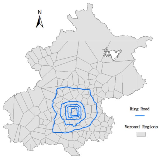 Administrative regions are among the commonly used geospatial units. However, the area of each administrative region is too large for the elderly spatial distribution to be illustrated in detail. Shao et al. [20] adopted an aggregated method to group bus stations into small cells for constructing a Voronoi diagram. The Voronoi diagram partitions a plane into regions close to the given sets of seed points [46]. In our study, the Voronoi diagram is still utilized to construct a new geographic unit. Bus stops are clustered by the clustering method to calculate the seed points for constructing the Voronoi diagram. The plane refers to the whole area of a city, and the Voronoi diagram is the partition of a city, where each polygon represents a cluster result of the bus stop [20]. This method considers not only the spatial locations of the stops in a city, but also the number of the elderly who use the stops. Compared with the partitioning of a city by administrative regions, the advantage of the proposed method is that the area of each region is smaller than the traditional administrative region and thus, can provide a detailed distribution. The data-driven method based on the usage of stops reflects the real/frequent living place. The proposed method in this study, which is based on these data, is therefore more reliable. Figure 6 presents the Voronoi diagram with the regions as grey polygons, and the blue lines show the Ring Road of Beijing. Because of the limitations of the dataset, in remote areas with a low density of stops or none at all, the corresponding polygons are much larger than those of areas with a high density of stops. In Figure 6, for example, there are large polygons in the northern part of the city, and most of the small-polygon regions are located in the center of the city. As a comparison, 328 administrative counties are used to represent the analysis results.