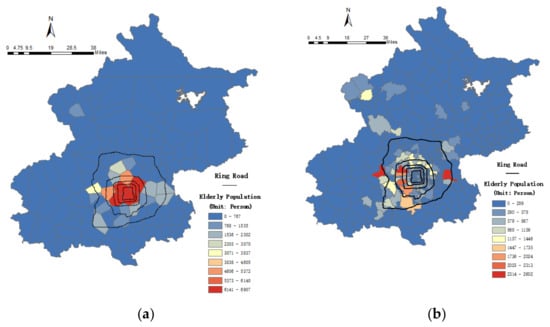 Figure 7 shows the spatial distribution of the elderly in the 147-polygon Voronoi diagram and 328 counties, using the home location detection method; the black lines indicate Ring Road. From the distribution of the colored regions in Figure 7a, we can see that the regions with high population density are concentrated in the center of the city. Remote regions have lower population densities. The area of each region in the Voronoi diagram is smaller than the administrative region, and thus, the elderly spatial distribution is illustrated in greater detail. Figure 7b shows the elderly cardholders distribution using 328 counties’ administrative regions. It contains more polygons than the former result in a smaller area of each polygon. As the areas of polygons in the center are smaller than the others, the population is lower than the others. Around center areas, the elderly cardholders’ distribution is similar with Figure 7a.