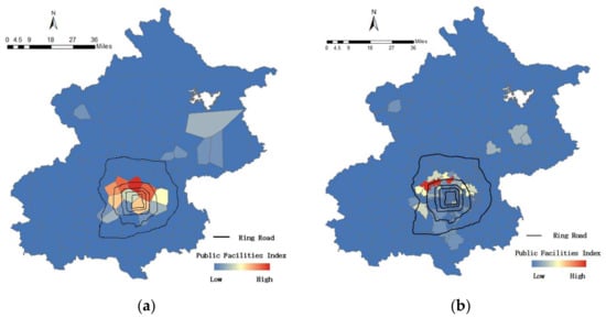 Figure 8 shows the spatial distribution of the public facilities index in the Voronoi diagram and 328 counties. From the figure, we can see that higher values of the index are mainly concentrated in the north center of the city from the 4th ring road to 5th ring road, and lower values are in the remote regions. The reason is that we are using park areas as one of POI factors to calculate the public facilities index, and the large parks are located in those regions. This reflects the fact that the public facilities development is unbalanced. At the center, the density of public facilities is higher than in the remote regions. This explains that most of the home locations of elderly cardholders are located with comprehensive public facilities. In a future study, we will consider more rational calculation methods of the public facilities index.