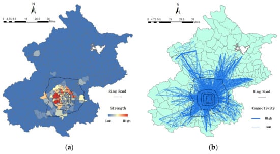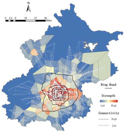 Figure 9 is the visualization result of connecting the pair of regions with the strength value. The black circular lines indicate the Second to Sixth Ring Road. The color variations from blue to red indicate the strength level, from low to high. The grey lines stand for the number of the elderly travels between the two regions. We divide them into high level and low level. The grey straight lines mean there is a large number of the elderly traveling between two regions; the grey broken lines show the opposite. We can see that regions with high strength have high connectivity with each other. Similar to the elderly cardholders’ distribution, high-strength regions and connectivity are located at the center of the city, which shows clearly a cluster pattern and unbalanced distribution.