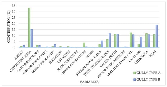 In the study area, type A gullies occupied a smaller portion than the gullies of type B, which were more extensive. Gullies of type A were located in higher elevation areas and along the hillslopes, while gullies of type B developed mainly along the flatter valley bottom areas where the incision exposed stratified colluvium or alluvium on low-level terraces. We demonstrated that the MaxEnt approach can differentiate between the two gully types with acceptable precision and the independent variables that drive the formation of gully erosion. Indeed, the ROC curves obtained for both types of gully erosion showed AUC values above 0.7, which indicate an acceptable level of model performance [89]. To reveal information about the driving factors that characterized the spatial distribution of the two gully types, we derived and evaluated the variable importance.