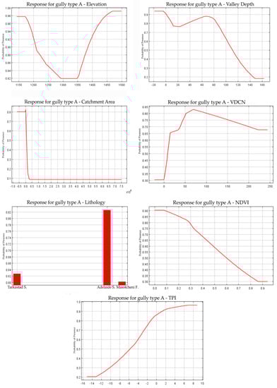 As shown in Figure 4, the following environmental layers played a significant role in the formation of the gully erosion: catchment area, NDVI, Vertical Distance to Channel Network, lithology, valley depth, TPI, land use and SPI. To understand the specific contributions of the variables, the individual variable response curves were derived, as illustrated in Figure 5 and Figure 6 for gully types A and B, respectively.