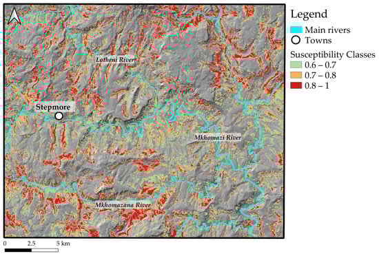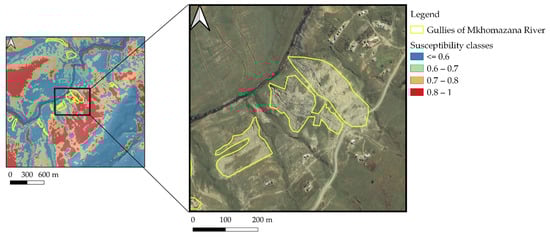 The trained model was validated with gullies of the Mkhomazana River basin, using the inventory proposed by Bosino et al. (2020) [43]. The results showed good correspondence with the higher values of susceptibility and the presence of gullies (Figure 10). The results indicate that the model provided appropriate predictions of susceptible gully areas prone to future gully erosion development. Proper land management activities should focus on these areas in order to reduce soil degradation and loss of soil.