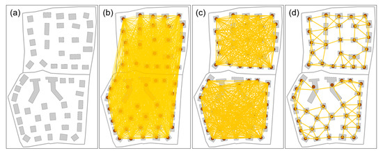 Graph construction for input buildings: (a) original buildings, (b) fully connected graph, (c) graph after removing the edges that intersect the roads, and (d) four-nearest neighboring graph.