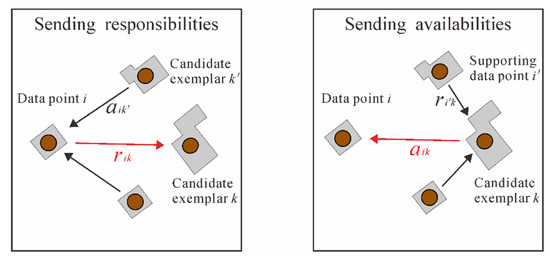 As depicted in Figure 2, two kinds of messages are exchanged between connected buildings to search for appropriate clusters and their exemplars. One message is represented as the responsibility matrix R = [rik]m×m, in which rik is sent from building bi to candidate exemplar building bk. The value of rik reflects the accumulated evidence for how suited bk is to serving as the exemplar for bi while considering other potential exemplars for bi. Another type of message is represented as the availability matrix A = [aik]m×m, in which aik is sent from candidate exemplar bk to bi. The value of aik reflects the degree of how appropriate it would be for bi to choose bk as its exemplar while considering the support from other buildings that bk should be an exemplar.