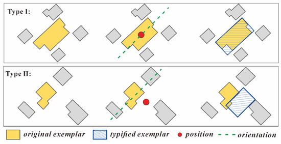 Regarding the position, it is reasonable to represent each building cluster as its exemplar that is chosen as the cluster center. However, other geometric attributes of each exemplar building, including size, shape, and orientation, need to be adjusted according to the characteristics of the whole building group, as well as the changes in the scale. In addition, the importance of the exemplar building in each cluster should be considered in the determination of the typified representation. Therefore, two types of building cluster are identified with respective typified representations generated in different ways to highlight the importance of the exemplar building in each cluster, as depicted in Figure 3.