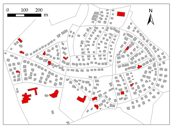 As rendered in red in Figure 4, buildings that are prominent in size or convey specific semantics, such as a hospital or school building, were labeled as important objects. The importance values of these buildings were set to 1 in the initialization of the preference parameter, so that as many as possible would be retained during typification. The rest of the buildings were assigned importance values of 0, and parameter δ was set to the median of the pairwise similarities. The damping factor λ was set to 0.7 by the trial-and-error approach to alleviate the possible oscillations. The maximum number of iterations t-max and the preference adjustment step were set to 300 and 0.01, respectively, according to the preliminary results.