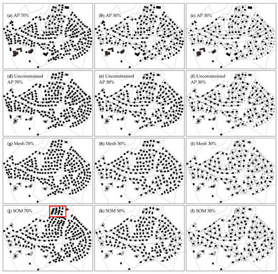 Typification results of. (a–c) the AP method with retention ratios of 70%, 50%, and 30% respectively; (d–f) the unconstrained AP method with retention ratios of 70%, 50%, and 30% respectively; (g–i) the Mesh method with retention ratios of 70%, 50%, and 30% respectively; (j–l) the SOM method with retention ratios of 70%, 50%, and 30% respectively. Gray polygons denote the original buildings, and black polygons denote the typified buildings.