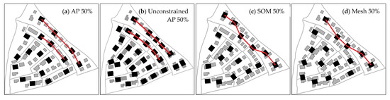 Preservation of the local structural characteristics along the roads by: (a) the AP method, (b) the unconstrained AP method, (c) the Mesh method, and (d) the SOM method, respectively, with 50% retention ratio. Gray polygons denote the original buildings, black polygons denote the typified buildings, and red lines denote the structural patterns formed by the buildings.