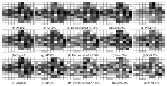 Visual comparison of spatial structure preservation: (a) density distribution of original buildings; (b–e) density distributions of the typified buildings by the AP method, the unconstrained AP method, the Mesh method, and the SOM method, respectively, with 70% retention ratio; (f) density distribution of original buildings; (g–j) density distributions of the typified buildings by the AP method, the unconstrained AP method, the Mesh method, and the SOM method, respectively, with 50% retention ratio; (k) density distribution of original buildings; (l–o) density distributions of the typified buildings the AP method, the unconstrained AP method, the Mesh method, and the SOM method, respectively, with 30% retention ratio.
