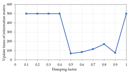 In addition to evaluating the typification results, the analysis of relevant parameters also measures the effectiveness of the proposed method from the algorithmic level. The most important parameter of the AP algorithm is the damping factor , which controls whether the algorithm converges. We took the retention ratio of 50% as an example and set the maximum number of updates on the information matrix in the AP clustering to 500. Figure 8 shows the update times required for the model to perform the AP clustering as the damping factor varied.