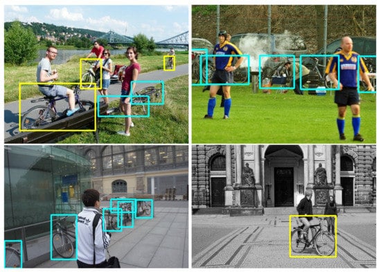 Examples from our annotated Dresden subset of the YFCC100m dataset. We manually labeled both moving (yellow boxes) and stationary (cyan boxes) bicycles.