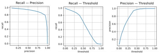 Precision and recall of bicycle detections in relation to the confidence threshold : the first graph shows the recall–precision curve, while the second and third graphs represent the relationships of recall and precision to the confidence threshold separately.
