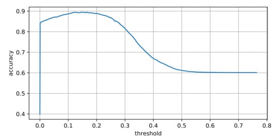 In order to determine an optimal person assignment threshold , we considered all true positive bicycle detections and their assigned maximum person overlap . For all thresholds , we computed the fraction of detections that are correctly classified as either moving or stationary. As Figure 5 shows, this classification accuracy peaks at roughly . We thus set the person assignment threshold to the corresponding value of .