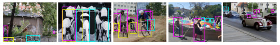 We purposely do not use the mean average precision metric (mAP, cf. Section 3.2) commonly utilized in object detection literature for evaluation with the COCO dataset [,]. The mAP metric computes the mean of the area under the precision-recall curve over a range of . While this metric is well suited for comparing the performance of object detection algorithms independent of confidence threshold and partially independent of IoU threshold , it does not provide information about the accuracy of an algorithm in a practical setting, where these thresholds must be set to a specific value.