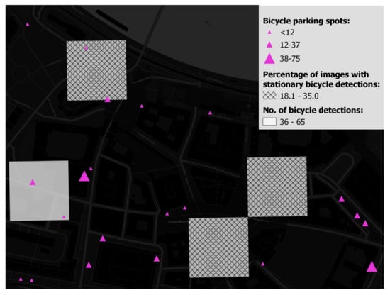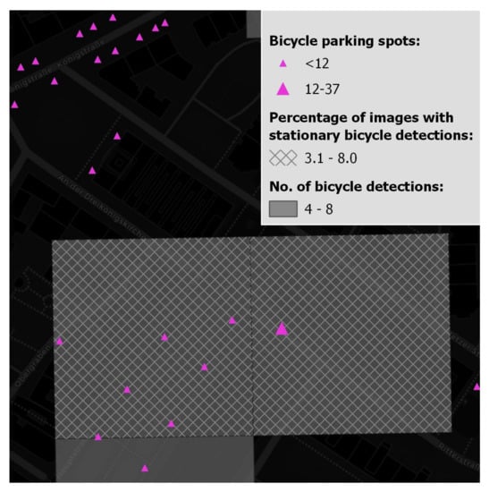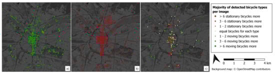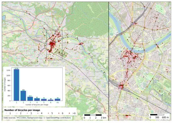 In general, data availability is the only limiting factor for transferability in our approach, emphasizing the opportunities social media data can bring to urban analysis []. Requirements regarding computing capacity are rather low for applying the method to other cities, as the pre-trained object detection algorithm is utilized for identifying and classifying bicycles, and conventional GIS operations enable spatial exploration, analysis and visualization []. In comparison to the other methods for obtaining bicycle traffic data mentioned in Section 2, our approach is completely feasible without any structural installation, e.g., stationary counting stations or bicycle-mounted GPS sensors.