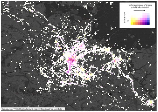 As we used the YFCC100m dataset, which covers a time span of 10 years, we only worked with temporally compressed location data. Compared to other bicycle-related data sources, this is at first a major drawback of our approach. Nevertheless, different spatio-temporal analyses would still be feasible: First, it is possible to analyze cumulated frequencies of bicycle detections in the dataset with respect to temporal categories such as weekdays, months or years []. These spatial-temporal patterns can provide insights into daily and seasonal routines of urban cyclists, and complement and verify the continuous data streams of stationary counters and BSS data [,]. Second, our method could be used as an indicator for the success of existing infrastructure, such as parking facilities or bicycle highways. It would be possible to compare the spatial pattern of detected bicycles before and after the date of construction and, therefore, detect changes in bicycle-related traffic flows or the density of detected bicycles for each grid cell we used in our case study. The capability of social media to acquire information about interventions in different events has already been shown in numerous studies, even though most of them examined more significant interventions such as in cases of traffic incidents or natural disasters [,].