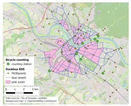 - Landeshauptstadt Dresden, S.u.T. Dauerzählstellen für den Radverkehr. Available online: http://www.dresden.de/media/pdf/Strassenbau/Dauerzaehlstellen_Stadtplan.pdf (accessed on 5 August 2021).